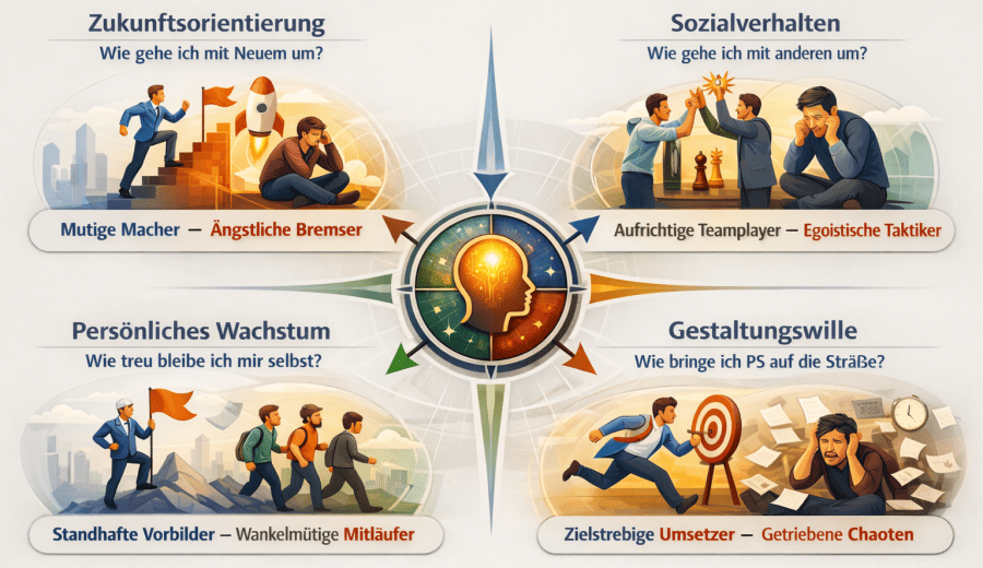 | 4. Gestaltungswille | Fokussierte Willenskraft: Systematische Umsetzung von Zielen trotz Niederlagen. | Hyperaktives Chaos: Verzettelung, Stress ohne Resultate, mangelnde Konsequenz. |